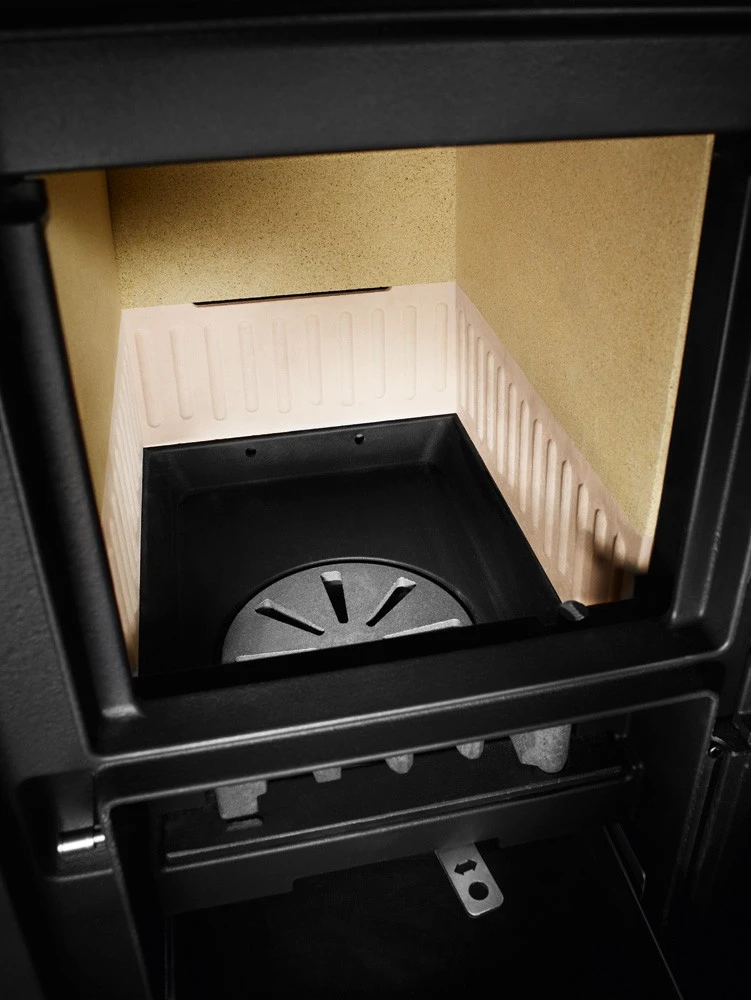 - Die Ausmauerung des Feuerraums aus Feuerbeton und Vermiculite ermöglicht hohe Feuerraumtemperaturen und eine große Temperaturbelastbarkeit. Ausmauerung wird lose passgenau gesteckt.