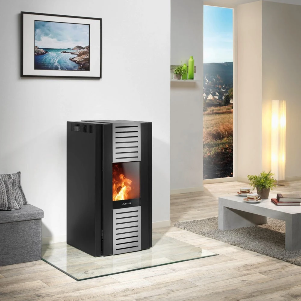 Der wasserführende Pelletofen Sirkos Aqua besitzt ein Bedienfeld mit einem übersichtlichem Display zur einfachen Handhabung über diese Sie nach persönlichen Bedürfnissen die An- und Abschaltzeiten einstellen können. Damit Sie in einen langen Feuergenuss kommen hat dieser Ofen einen extra großen Pellettank von ca. 35 kg Füllmenge und ist durch die Schiebeabdeckung leicht zu befüllen. Die temperaturabhängige Leistungsregelung garantiert eine gleichmäßige Raumtemperatur.
