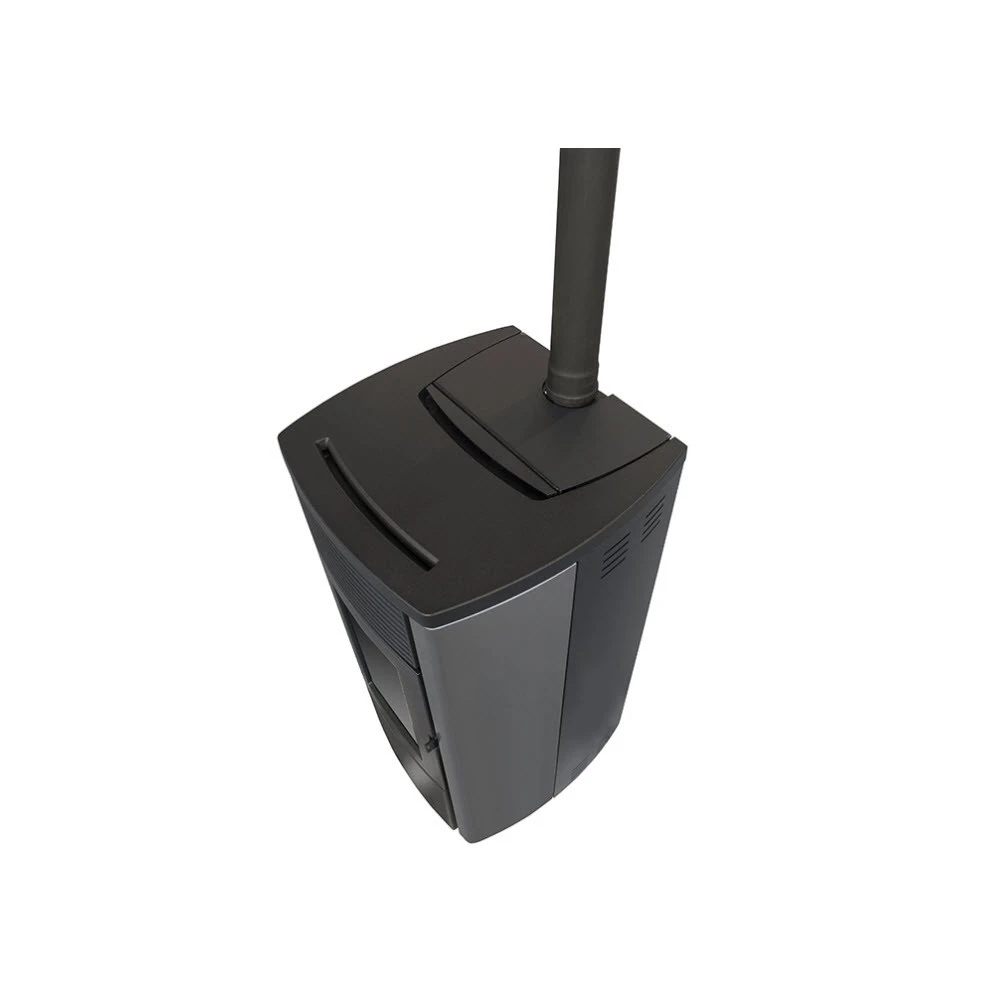 Dieser Pelletofen ist auch in der Version mit Rauchabzug oben statt hinten erhältlich. So ist eine Montage direkt an der Wand möglich; durch die geringere Tiefe des Ofens wird der Wohnraum optimiert.