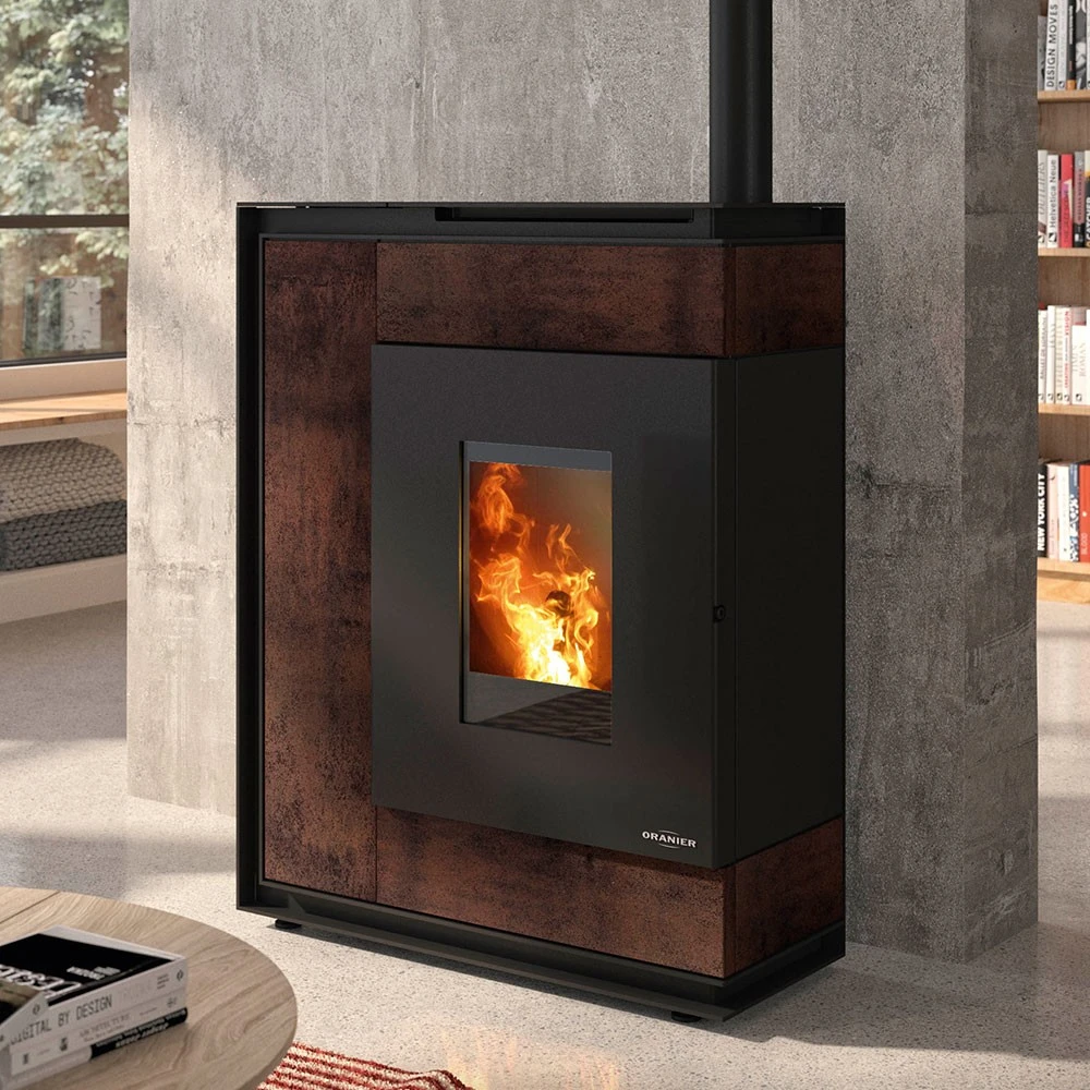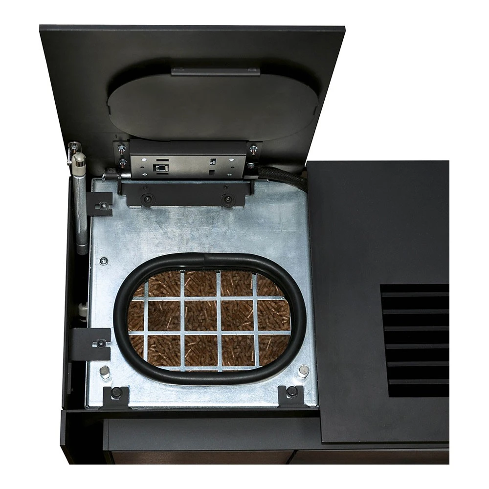 Der Pelletofen ORANIER Boreas erinnert mit seiner geringen Tiefen an einen schmuckvollen Schrank und sorgt mit seiner Verkleidung hergestellt aus dem faszinierenden Werkstoff Sintered Stone für ein besonders schönes Design-Erlebnis. Dies ist ein Verbundsmaterial bestehend aus Stein und Harz, ist extrem kratzfest, hygienisch und leicht zu reinigen. Er lässt sich besonders dünn verarbeiten, sodass er beim Design des Ofens elegant eingefügt werden kann. Dieser Ofen lässt sich mit der beigefügten Fernbedienung oder dem Smartphone via WiFi-App bequem aus der Ferne steuern und sorgt dabei mit seinem extragroßen Pellettank für ein langanhaltende wohlige Wärme.