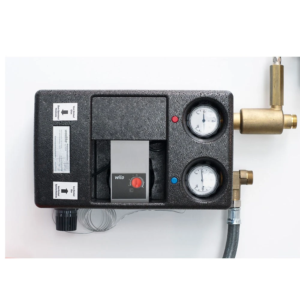 inklusive Hocheffizienzpumpe (Wilo Yonos Para RS 25/6 – RKC), Schwerkraftbremse, 22 mm – Schneidringverschraubung, Isolierung und Wandhalterung.
